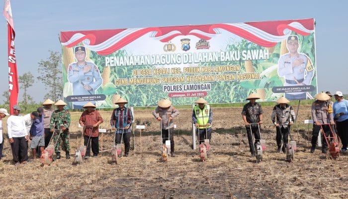 Dalam rangka mendukung program ketahanan pangan nasional, Kapolres Lamongan AKBP Agus Dwi Suryanto, S.I.K., M.H., melakukan penanaman jagung secara simbolis di lahan baku Desa Kedali, Kecamatan Pucuk, Kabupaten Lamongan, pada Kamis (31/07/2025).