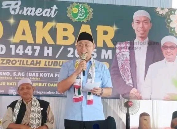 Domainrakyat.com-LUBUK LINGGAU-Wali Kota Lubuk Linggau, H Rachmat Hidayat menghadiri acara Maulid Akbar Nabi Muhammad SAW 1447 H di Lapangan Kampus Pondok Pesantren Mazro’ Illah Kota Lubuk Linggau, Kamis (18/9/2025).