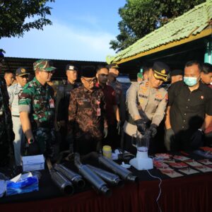 Selain ribuan liter miras dan puluhan gram sabu, petugas juga menyita berbagai barang bukti pendukung lainnya seperti sepeda motor (Honda Beat dan Yamaha N-Max), senjata tajam, serta alat komunikasi.