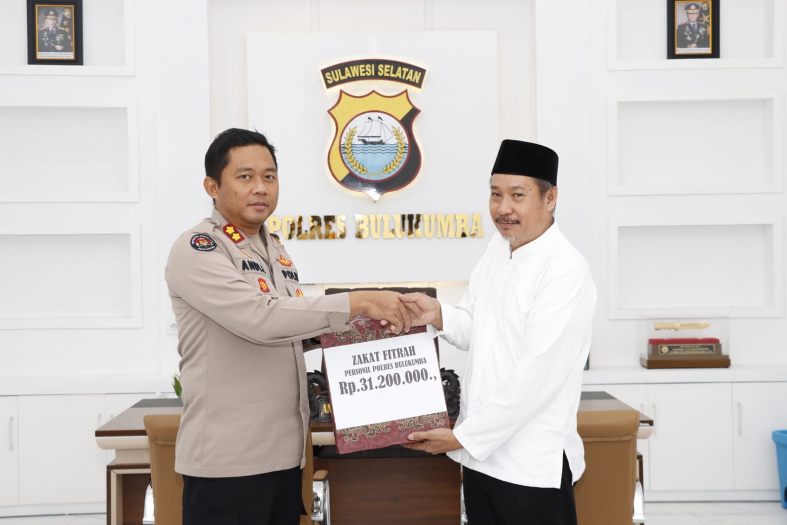 Kapolres Bulukumba secara simbolis menyerahkankan langsung Zakat fitrah kepada Ustadz Bustan Kadir,S.Ag, Wakil ketua 1 Bidang Pengumpulan Baznas dengan jumlah zakat sebesar Rp 31.200.000.