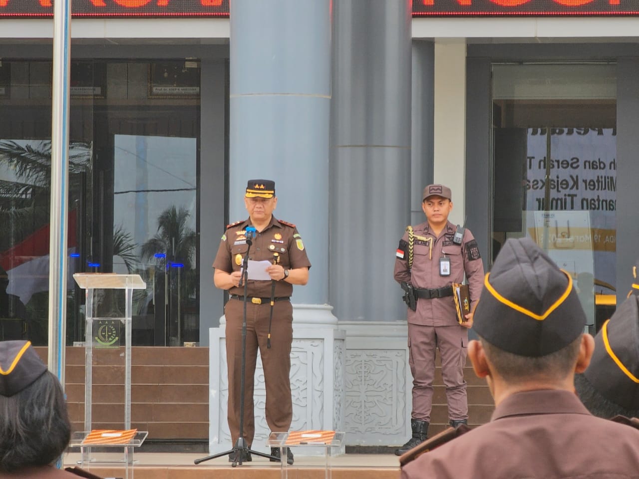 Dalam Upacara tersebut dipimpin langsung oleh Kepala Kejaksaan Tinggi Kalimantan Timur Dr. Iman Wijaya, S.H.,M.Hum. dan diikuti para Asisten pada Kejaksaan Tinggi Kalimantan Timur, para Kepala Kejaksaan Negeri se Kaltim, Kabag TU, dan para Koordinator, seluruh pegawai pada Kejaksaan Tinggi Kalimantan Timur, Kejari Samarinda dan Kejari Kutai Kartanegara serta anggota IAD Wilayah Kaltim.