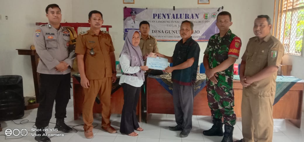 Pesawaran, domainrakyat.com – Pemdes Gunung Rejo , Kecamatan Way Lima, Kabupaten Pesawaran, membagikan (BLT-DD) secara tunai Tahun anggaran 2025, kegiatan berlangsung di Balai Desa setempat, pada hari Senen (24/3/2025).