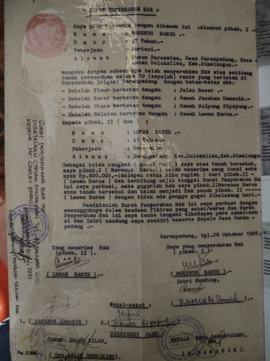 Surat penyerahan hak Marenus Barus kepada Leman Barus (foto: dok.istimewa)