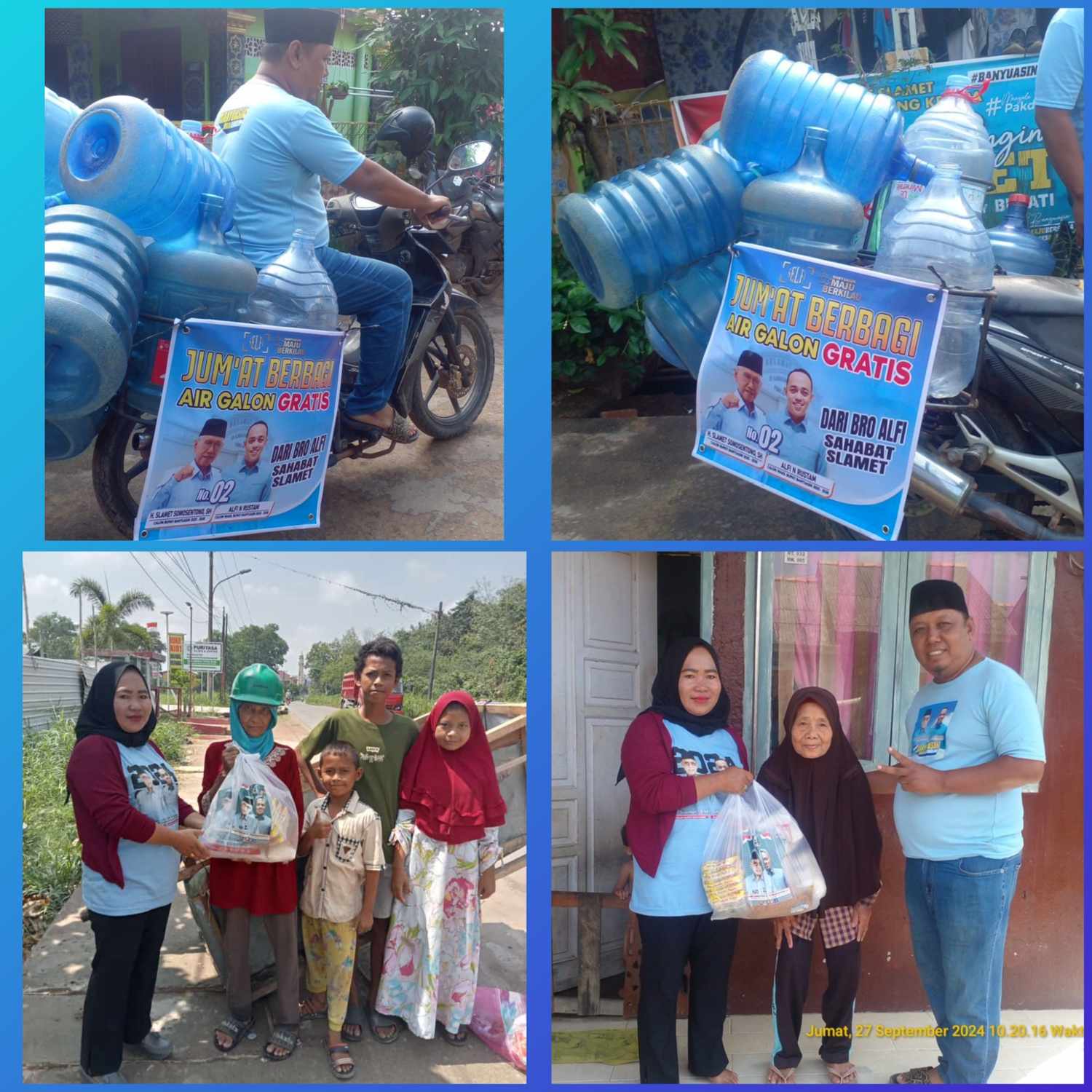 Banyuasin,domainrakyat.com – 27 September 2024 – Relawan Sahabat Slamet Talang Kelapa kembali menunjukkan komitmennya dalam mendukung pasangan calon Slamet dan Alfi (Selfi) untuk Pemilihan Bupati dan Wakil Bupati Banyuasin 2025-2029. Hari ini, mereka menggelar program air isi ulang gratis serta membagikan paket sembako di dua titik di Kelurahan Sukajadi.