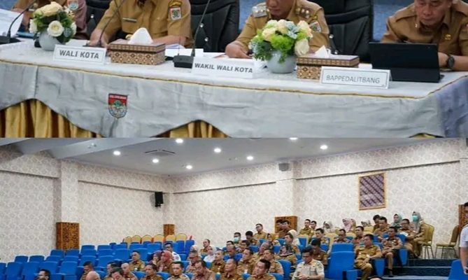 LUBUK LINGGAU-Wali Kota Lubuk Linggau, H Rachmat Hidayat, bersama Wakil Wali Kota, H Rustam Effendi, memimpin rapat sinkronisasi program perangkat daerah di Auditorium Bukit Sulap, Lantai 5 Kantor Wali Kota Lubuk Linggau, Selasa (4/3/2025).