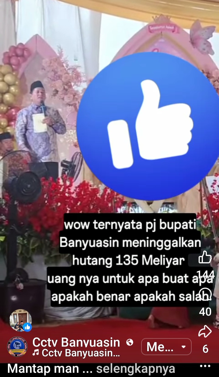 Banyuasin,domainrakyat.com-Beredar video di media sosial yg disampaikan oleh bupati Banyuasin Askolani dalam kata sambutannya meminta kepada masyarakat Banyuasin utk bersabar dalam proses pembangunan dibanyuasin, Karena APBD 2025 saat ini bukan diri nya yg menyusun dan mengesahkan, Karena beliau menjabat baru 6 bulan, bahkan pj bupati meninggalkan hutang 135 M, di Banyuasin.